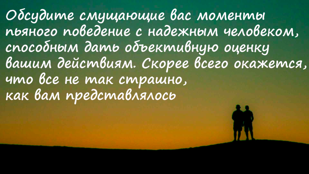 Отдельное внимание стоит обратить на ту ситуацию, когда человек действительно имеет определенную степень вины перед друзьями и коллегами, с которыми выпивал. Психологи отмечают, что когда в памяти имеется серьезная ситуация, от которой можно отталкиваться при самоанализе, то это уже очень хорошо