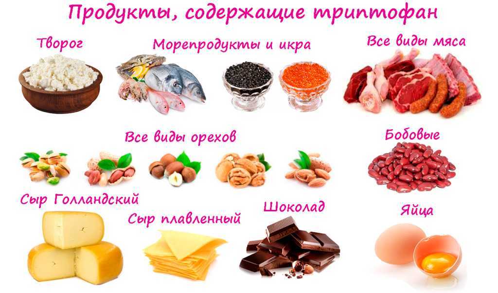 - Съесть продукты, являющиеся источником триптофана – вещества, из которого образуется серотонин: икра красная или черная, сыр, орехи, бобовые, все виды мяса и рыбы, яйца, молочные продукты, шоколад, какао.