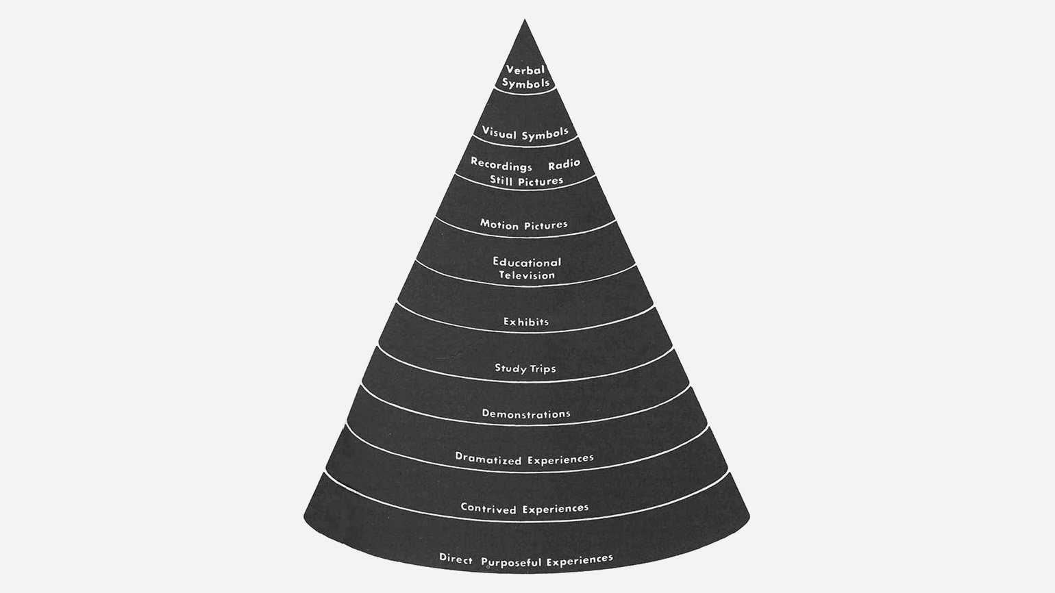 Неясно и то, как Эдгар Дейл стал ассоциироваться с пирамидой. В его книге «Аудиовизуальные методы обучения» (Audiovisual Methods in Teaching), впервые опубликованной в 1954 году, нет ничего определённо похожего. Однако в этой работе можно встретить «конус опыта» — схему, распределяющую образовательные форматы от самых абстрактных к самым конкретным: вербальные символы → визуальные символы → изображения, аудиозаписи, радио → фильмы → образовательные телепрограммы → выставки → образовательные экскурсии → демонстрации → театрализованная деятельность → симуляционная деятельность → практическая деятельность.