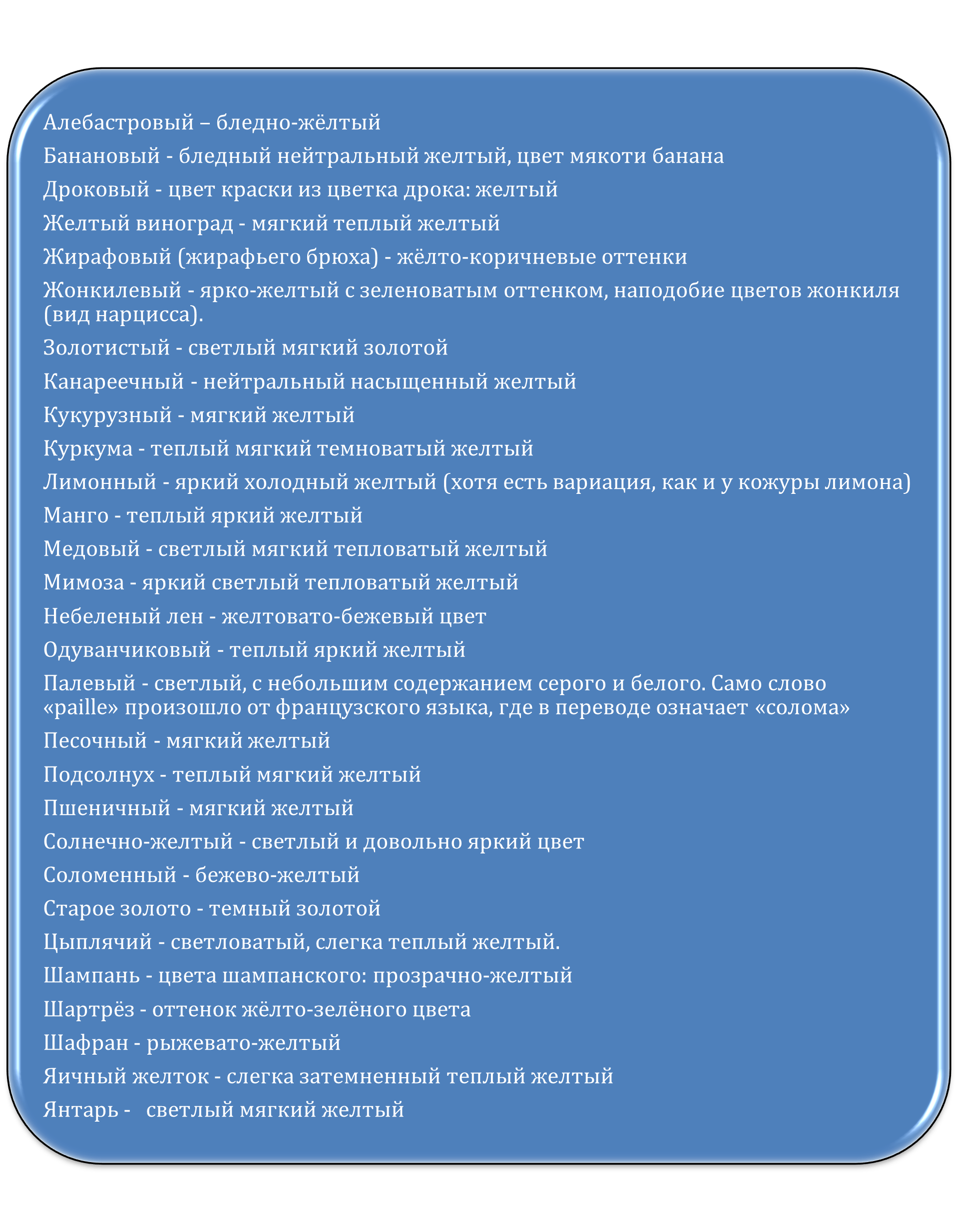 Сколько оттенков желтого вы знаете? В мире их насчитывается 115 оттенков. Вот лишь некоторые из них: