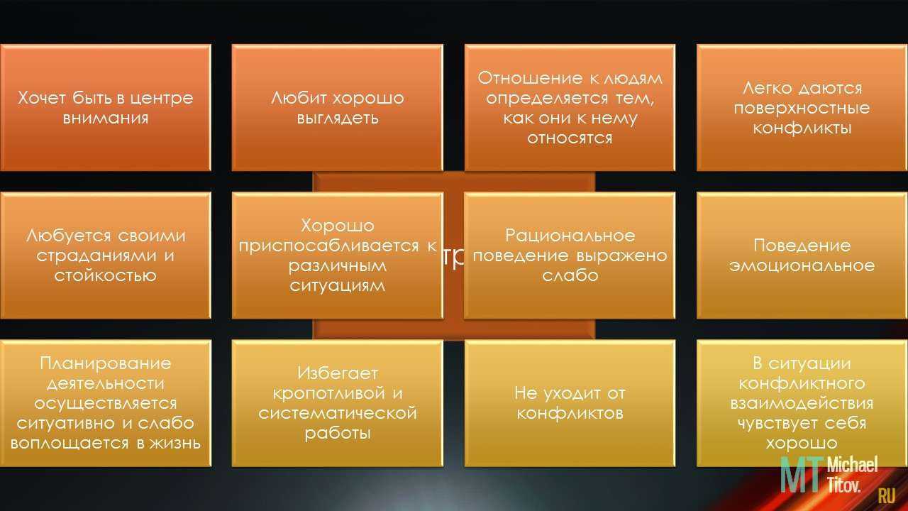 Представители этого типа склонны производить впечатление, обращать на себя всеобщее внимание, вызывать повышенный интерес. В любой ситуации они ведут себя нарочито вызывающе, обожают быть в центре событий, часто приукрашивая долю своего участия и влияния. Таким людям свойственно: