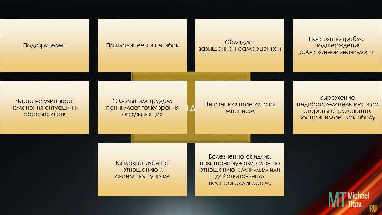 Подозрителен. Прямолинеен и негибок. Обладает завышенной самооценкой. Постоянно требует подтверждения собственной значимости. Часто не учитывает изменения ситуации и обстоятельств. С большим трудом принимает точку зрения окружающих, не очень считается с их мнением. Выражение недоброжелательности со стороны окружающих воспринимает как обиду. Малокритичен по отношению к своим поступкам. Болезненно обидчив, повышено чувствителен по отношению к мнимым или действительным несправедливостям.