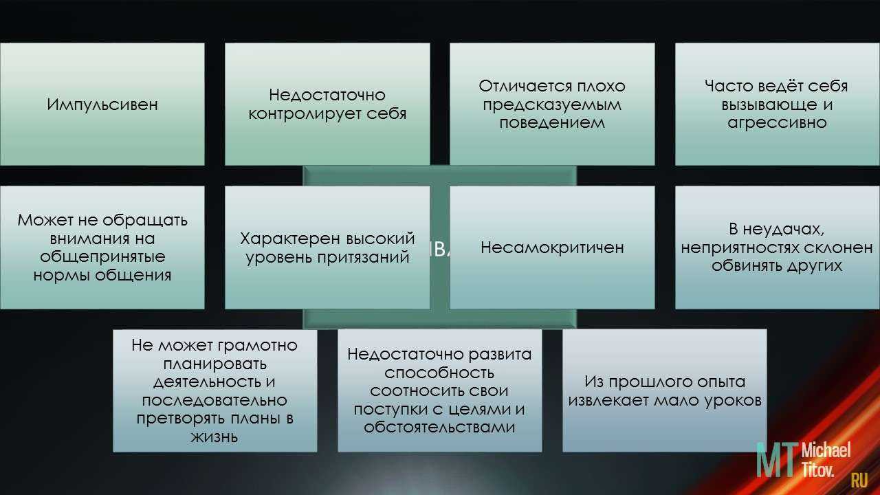 Импульсивен, недостаточно контролирует себя. Отличается плохо предсказуемым поведением, часто ведет себя вызывающе, агрессивно. Может не обращать внимания на общепринятые нормы общения. Характерен высокий уровень притязаний. Несамокритичен. В неудачах, неприятностях склонен обвинять других. Не может грамотно планировать деятельность, последовательно претворять планы в жизнь. Недостаточно развита способность соотносить свои поступки с целями и обстоятельствами. Из прошлого опыта извлекает мало уроков.
