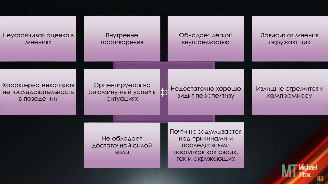 Неустойчивая оценка в мнениях. Внутренне противоречив. Обладает лёгкой внушаемостью. Зависит от мнения окружающих. Характерна некоторая непоследовательность в поведении. Ориентируется на сиюминутный успех в ситуациях. Недостаточно хорошо видит перспективу. Излишне стремится к компромиссу. Не обладает достаточной силой воли. Почти не задумывается над причинами и последствиями поступков как своих, так и окружающих.