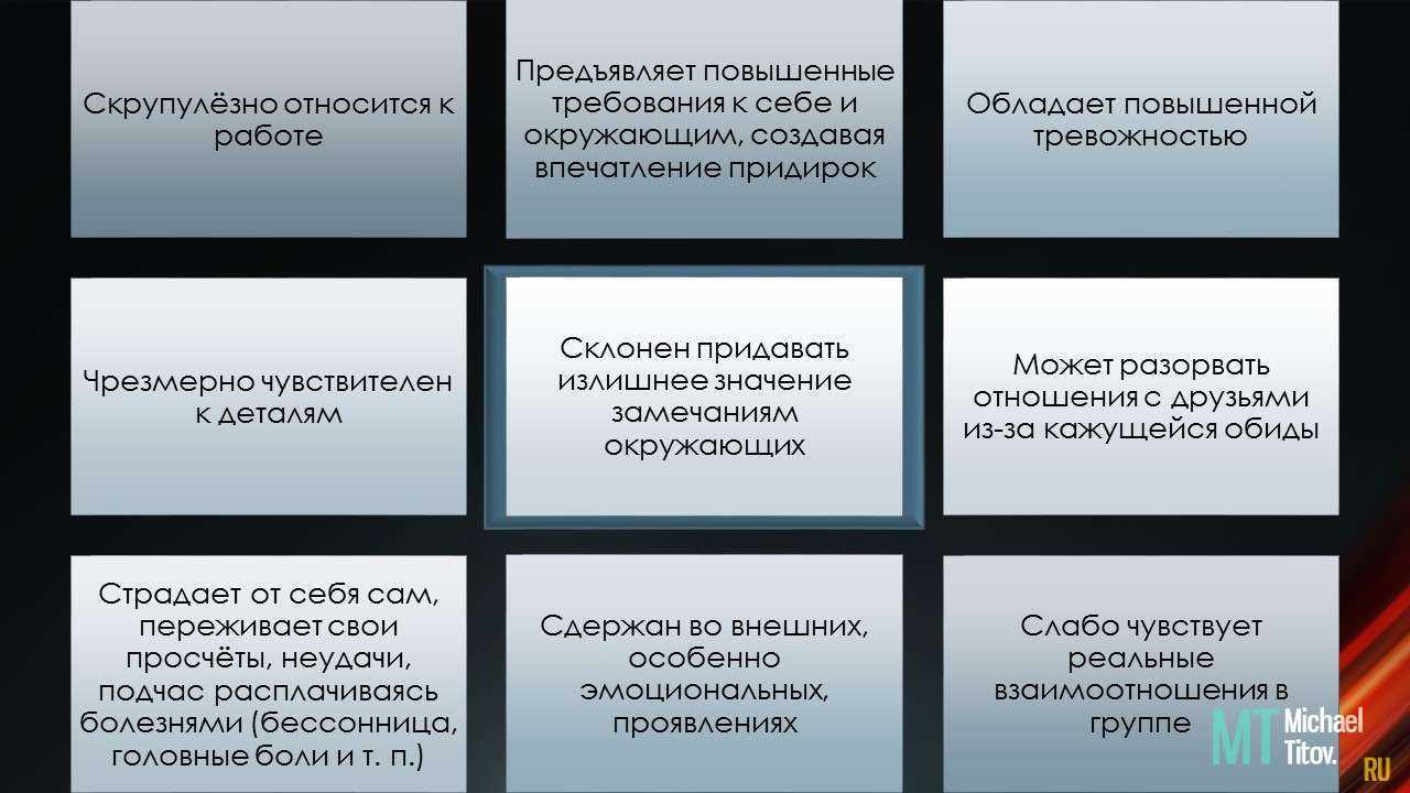 Скрупулёзно относится к работе. Предъявляет повышенные требования к себе и окружающим, создавая впечатление придирок. Обладает повышенной тревожностью. Чрезмерно чувствителен к деталям. Склонен придавать излишнее значение замечаниям окружающих. Может разорвать отношения с друзьями из-за кажущейся обиды. Страдает от себя сам, переживает свои просчёты, неудачи, подчас расплачиваясь болезнями (бессонница, головные боли и т. п.). Сдержан во внешних, особенно эмоциональных, проявлениях Слабо чувствует реальные взаимоотношения в группе.