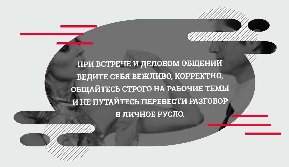 При встрече и деловом общении ведите себя вежливо, корректно, общайтесь строго на рабочие темы и не путайтесь перевести разговор в личное русло. В случае возникновения неловких моментов четко дайте понять бывшему, что вас связывают только рабочие отношения, и это не означает, что возможны какие-то иные связи.