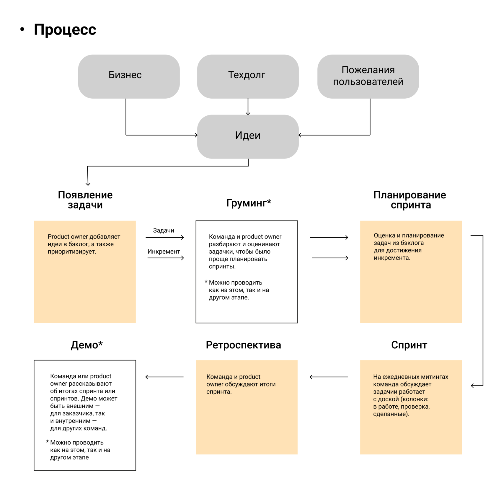 Важно, что каждая итерация и инкремент в рамках выделенного промежутка времени, который часто называют спринтами, по времени небольшие (в Скрам – от недели до месяца). При этом у нас появляется работающий продукт, мы получаем обратную связь от заказчика и пользователей и можем гибко доработать продукт (проверить наши гипотезы)